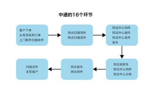 中通快遞在京津冀地區(qū)以生產(chǎn)路由和快件市場為中心進行整合,張家口、承德、唐山、秦皇島盡管從行政區(qū)劃上隸屬于河北,但在郵路組織上,他們隸屬于北京和天津管理中心。在路由的調(diào)整上,中通快遞設(shè)置了北京、唐山、邢邯、滄衡、保定等分撥中心,實現(xiàn)了分揀場地、分撥中心的聯(lián)通,帶動京津冀一體化。中通快遞還在京津冀地區(qū)加開了多輛網(wǎng)運班車,點對點多頻次,以保證時效,并將收發(fā)運投4大環(huán)節(jié)細化為16個層級(見圖表1),逐層進行管控,以標準化模式進行管理,使粗放的管理越來越精細化了。
