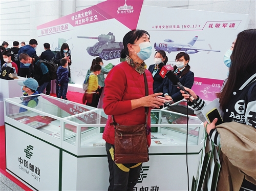 圖為北京郵政在中國人民革命軍事博物館設(shè)立的臨時郵局內(nèi),郵迷們積極選購郵品并接受媒體采訪。