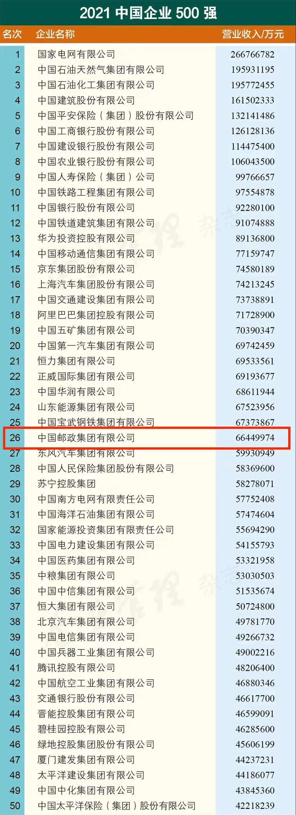 9月25日,在2021中國500強(qiáng)企業(yè)高峰論壇上,中國企業(yè)聯(lián)合會、中國企業(yè)家協(xié)會連續(xù)第20次向社會發(fā)布“中國企業(yè)500強(qiáng)”名單,中國郵政集團(tuán)有限公司位列第26位。