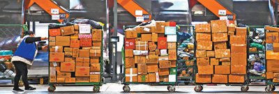 中國郵政集團有限公司河南省鄭州郵區(qū)中心,工作人員在轉(zhuǎn)移快遞包裹。新華社記者 張浩然攝