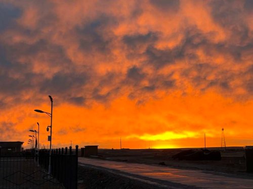 我突然想起今天早上,葛軍開車駛下青藏公路時(shí),車頭向東的一瞬,眼前的景色讓我愣在位置上一動(dòng)不動(dòng):東方的天空火紅一片,在地平線最東端,紅得最熾烈,最濃艷。剎那間,一束炙熱的光芒從紅綢帷幕似的天邊刺出來,像是熊熊燃燒的大火,灼燒著我的雙眼。我倆互相看看,都是一臉的“金色”——那是唐古拉山、長(zhǎng)江之源的日出。“這次采訪,值了?!蔽矣懈杏谘矍暗娘L(fēng)光,是我此行最好的禮物。葛軍沖我笑笑說:“多拍點(diǎn)?!?/p>