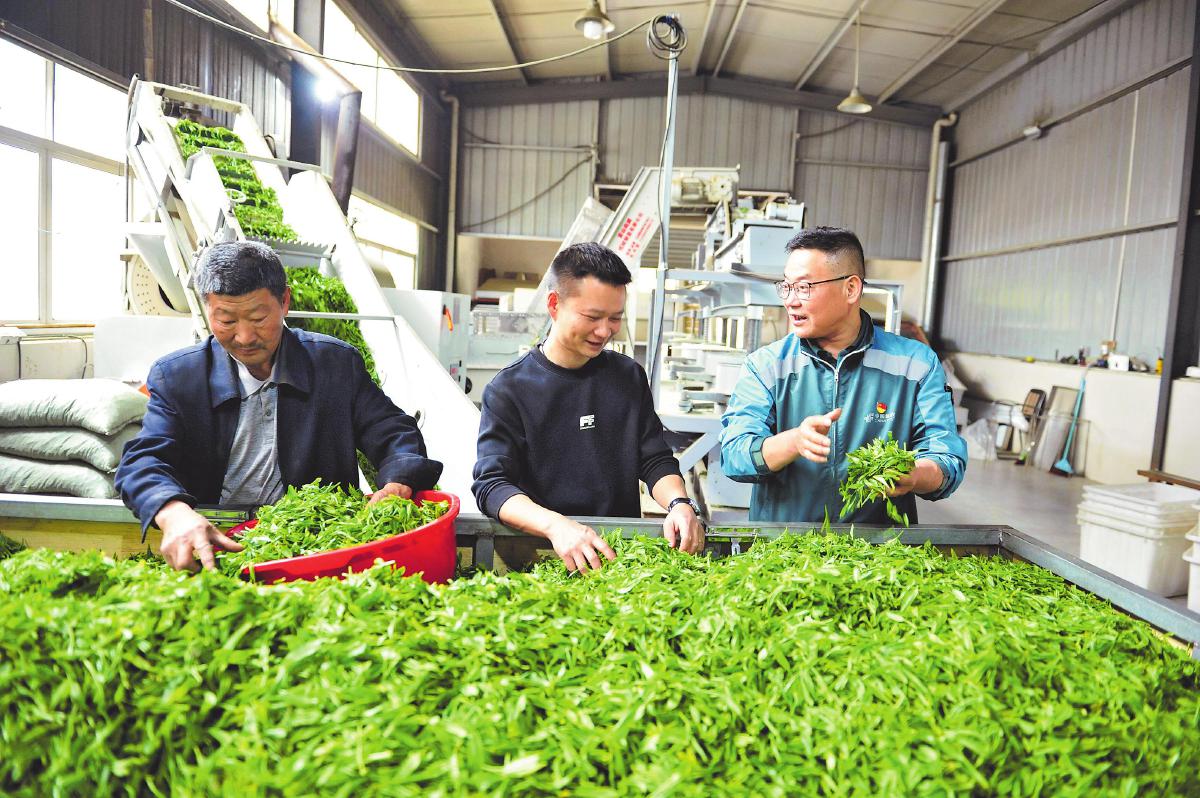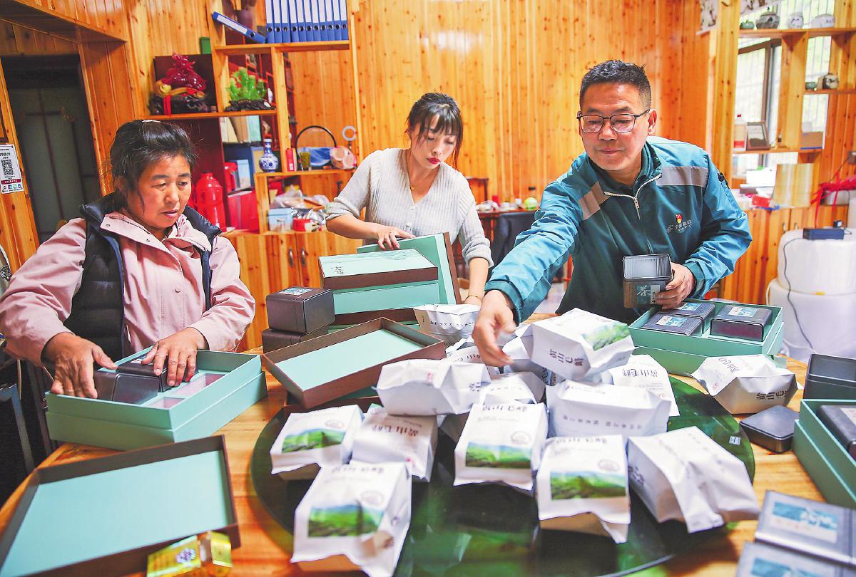 郵政攬投員與茶廠員工一起分裝茶葉。□徐雷 攝
