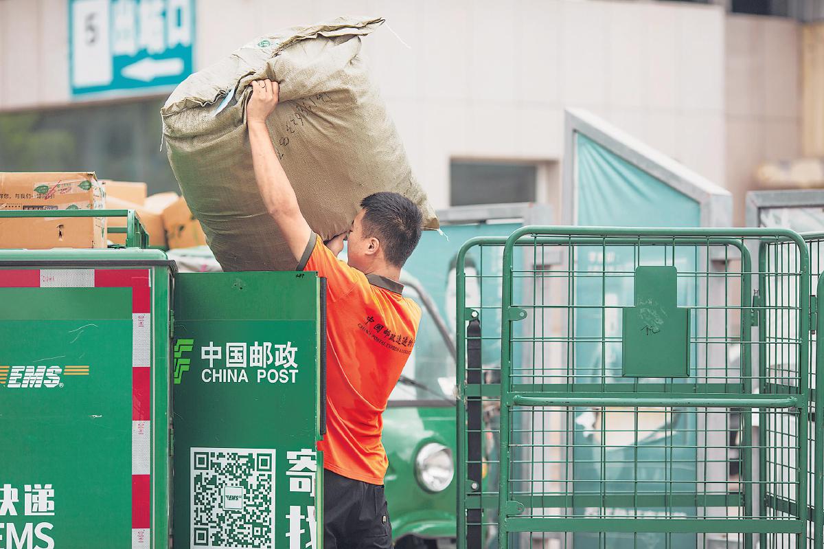 山東省沂源縣郵政分公司投遞員在裝運郵件。