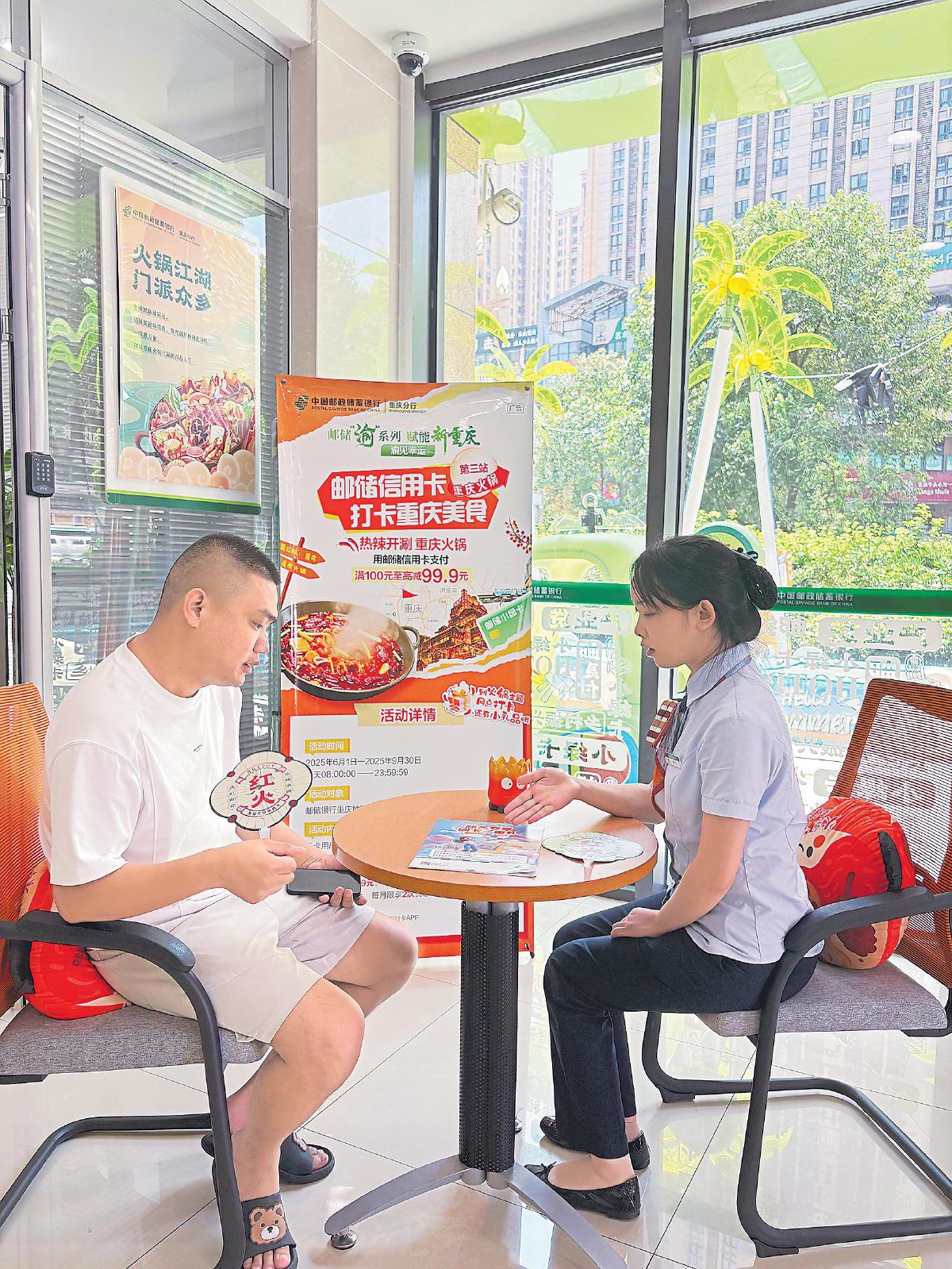 立足產(chǎn)業(yè)特色,該支行還推出了“火鍋產(chǎn)業(yè)貸”,以專業(yè)的金融服務(wù)為當(dāng)?shù)靥厣a(chǎn)業(yè)注入強勁動力。同時,該支行積極聯(lián)系網(wǎng)點周邊火鍋商戶,推出了信用卡立減活動?!罢娴氖翘珓澦懔耍覀兗腋浇芏嗷疱伒甓寄芟硎茑]儲銀行信用卡的優(yōu)惠。外地的朋友們暑期來重慶旅游,我都要帶他們嘗嘗地道的火鍋?!笨蛻敉跖块_心地說道。