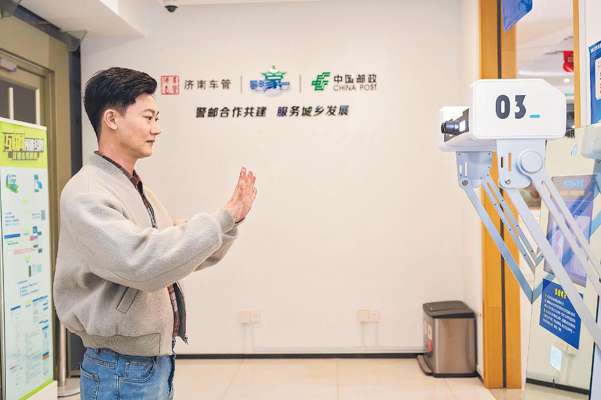 在濟南市趵突泉郵政支局警郵自助終端前,市民“一站式”高效辦理駕駛證換證手續(xù)。