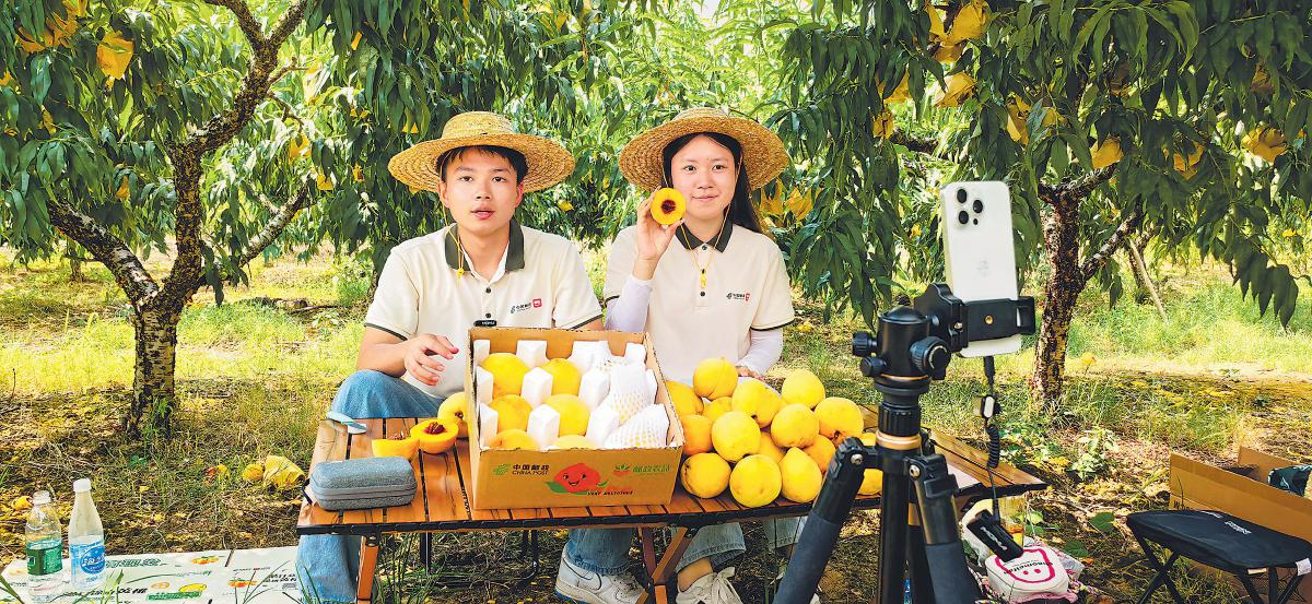 “家人們看過來!我們的桃子都是果農(nóng)們凌晨采摘,帶著露水的新鮮!”近日,在湖北省潛江市總口農(nóng)場果蔬基地的桃樹下,郵政主播拿起一個(gè)個(gè)飽滿圓潤的黃桃熱情推介。