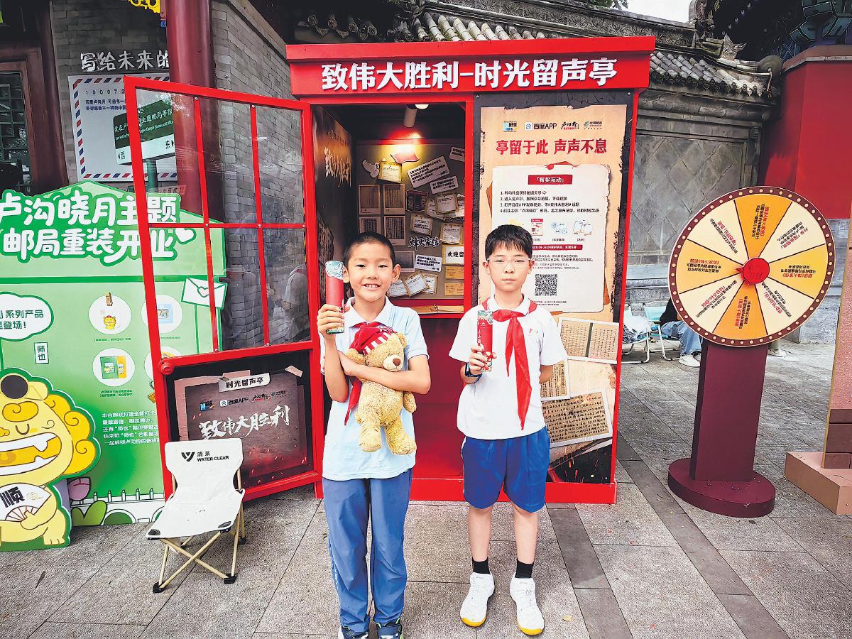 8月15日,“致敬偉大勝利”及烽火家信系列活動(dòng)在北京市豐臺(tái)區(qū)宛平城啟動(dòng)。該活動(dòng)由百度App聯(lián)合新華網(wǎng)、軍事博物館、退役軍人事務(wù)部、北京市郵政分公司、盧溝橋文化公園等單位共同舉辦。游客在“致偉大勝利”時(shí)光留聲亭旁,轉(zhuǎn)動(dòng)轉(zhuǎn)盤即可選擇錄制內(nèi)容,包括參觀抗戰(zhàn)展陳的體會(huì)、朗讀一封感人的抗戰(zhàn)家書或唱一首經(jīng)典革命歌曲,產(chǎn)生的優(yōu)質(zhì)視頻素材將由權(quán)威媒體整理后發(fā)布。參加“時(shí)光留聲”錄制的游客還可到旁邊的盧溝曉月主題郵局領(lǐng)取抗戰(zhàn)家書主題明信片,加蓋專屬紀(jì)念戳或購(gòu)買其他文創(chuàng)產(chǎn)品。