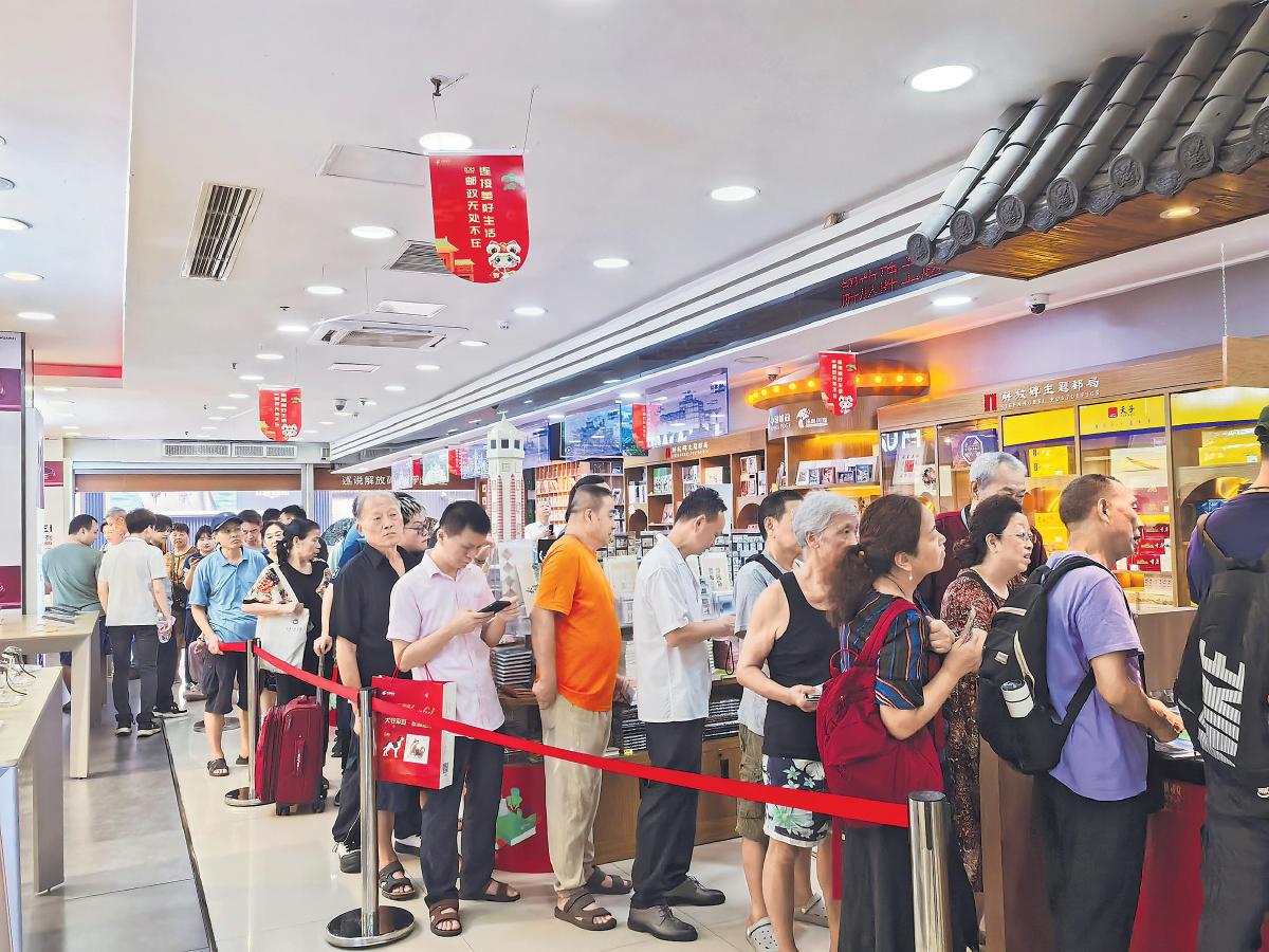抗戰(zhàn)勝利80周年紀(jì)念郵票發(fā)行當(dāng)日,重慶市解放碑主題郵局排起了長(zhǎng)隊(duì)?!跷很啊z影報(bào)道
