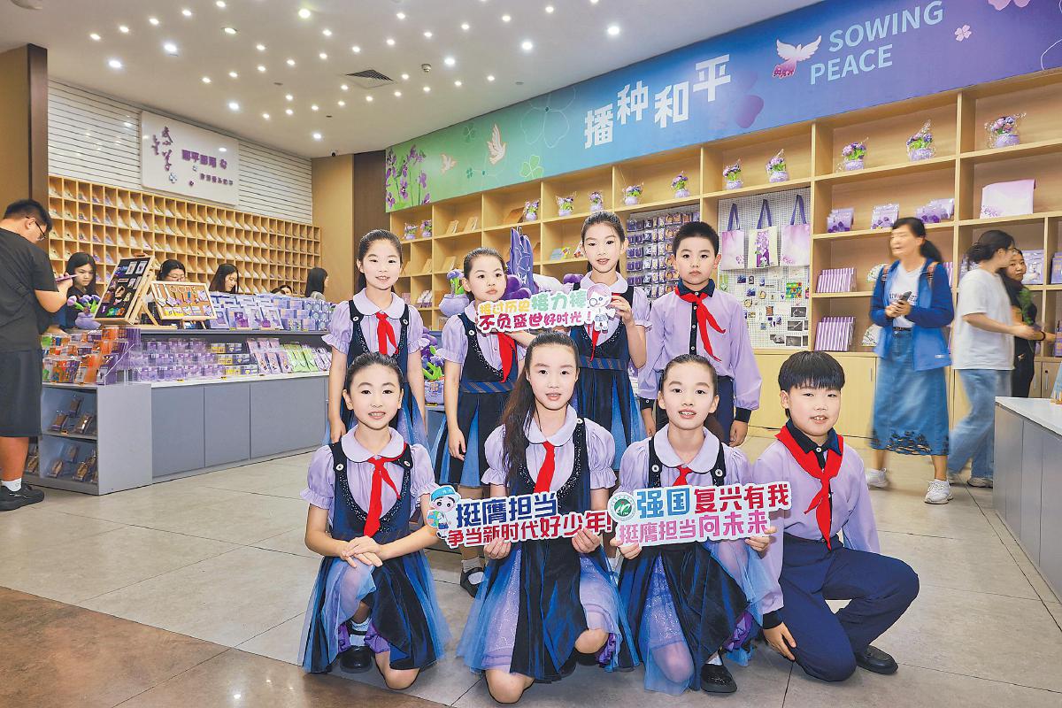 9月3日下午,江蘇省郵政分公司聯(lián)合侵華日軍南京大屠殺遇難同胞紀(jì)念館舉辦抗戰(zhàn)勝利80周年紀(jì)念郵票發(fā)行儀式。圖為在活動(dòng)現(xiàn)場(chǎng)表演節(jié)目的學(xué)生代表來到和平郵局打卡留念?!醢貫I豐 攝影報(bào)道