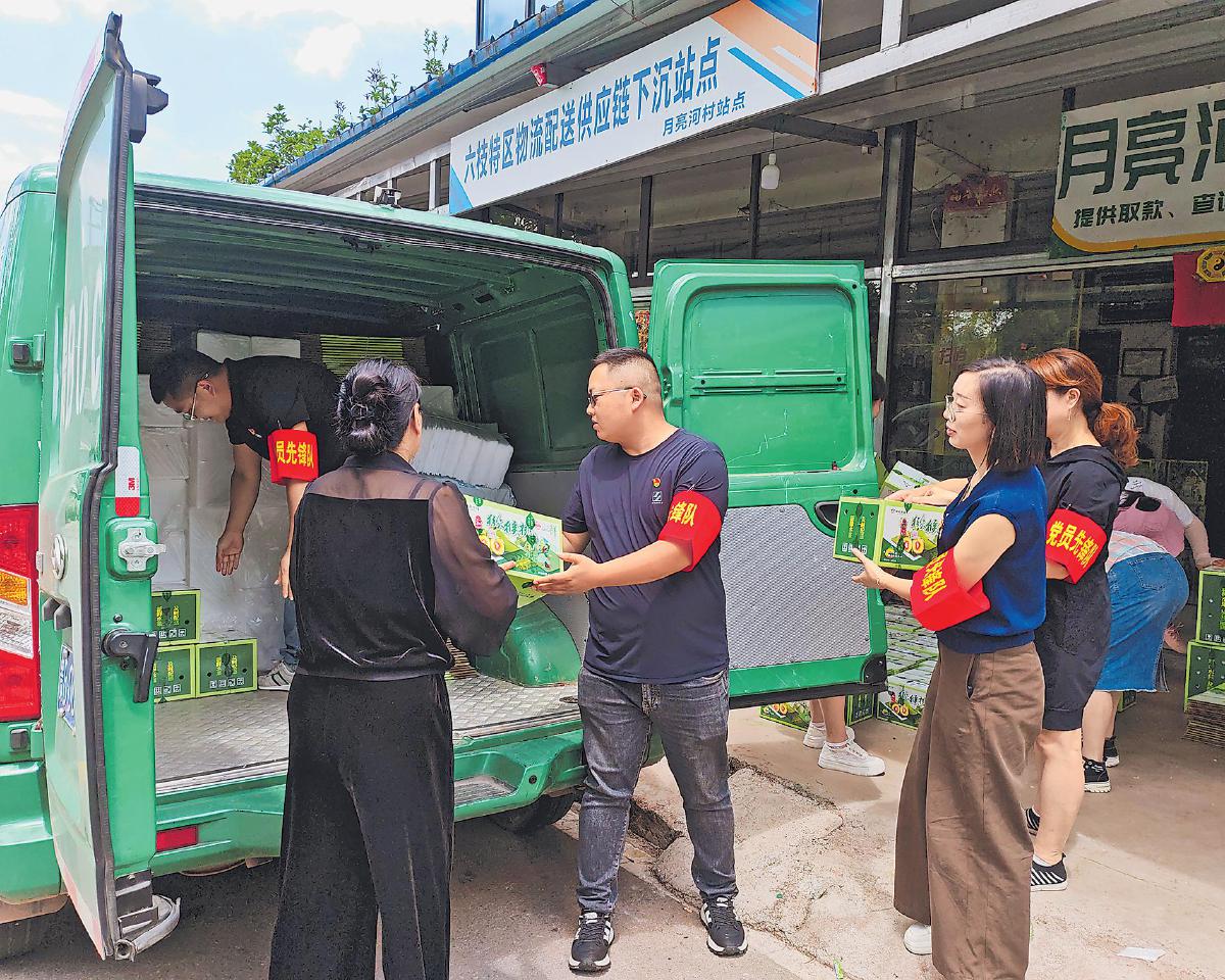 參加主題黨日活動(dòng)的黨員將獼猴桃郵件裝上郵車。
