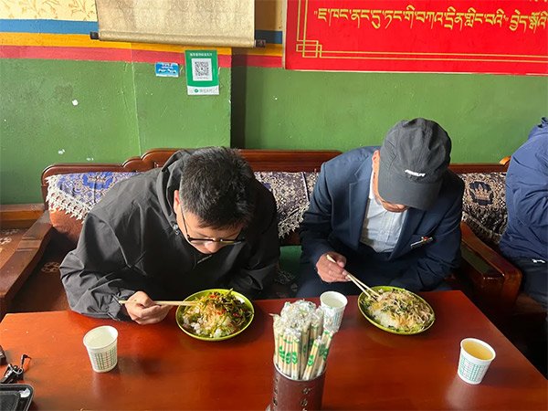 午飯時(shí)間,鄉(xiāng)政府旁的索多藏餐館里擠滿了來用餐的人。有觀光的游客,有像我們一樣到這里工作的外鄉(xiāng)人,還有本地的老百姓。記者和曲巴一起回憶起10年前在普瑪江塘只能吃面包、泡面的采訪經(jīng)歷。曲巴說:“現(xiàn)在鄉(xiāng)上開了3家餐館,大家也能吃上熱乎乎的飯菜了?!庇浾唿c(diǎn)了一份青椒肉絲蓋飯,曲巴要了一份小白菜蓋飯。我們吃得一干二凈!