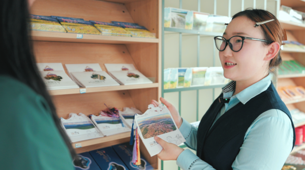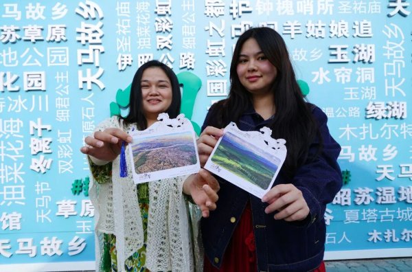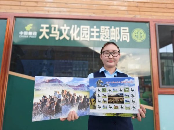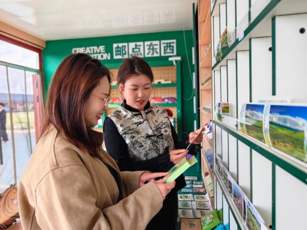 “馬上”郵局營業(yè)員彩紅說:“我手里的這款明信片是異形明信片,明信片上是伊犁風光,有天馬的元素,還有流蘇,很有設(shè)計感。我們還開發(fā)了以伊犁景點為主題的流沙冰箱貼,其中這款紫色的薰衣草冰箱貼是我們這里的爆款。”