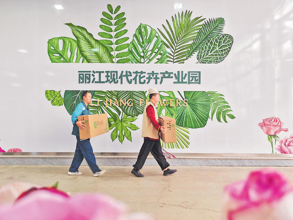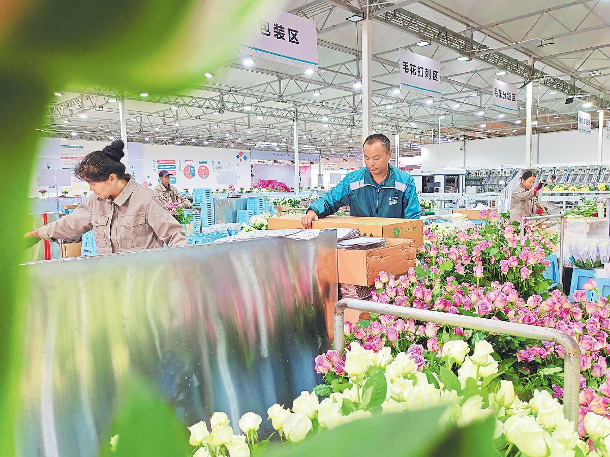 郵政小哥把一箱箱鮮花郵件搬上郵車,讓花香隨郵車駛向機(jī)場,奔向全國消費者。