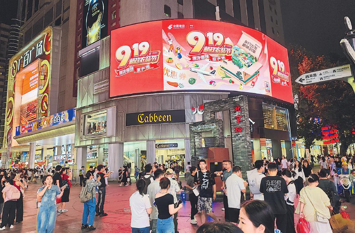 9月23日,2025年“中國(guó)農(nóng)民豐收節(jié)”拉開帷幕。當(dāng)天,“919”郵政農(nóng)品節(jié)宣傳大屏在北京、廣州、深圳、武漢、長(zhǎng)沙、南昌、哈爾濱多地繁華街區(qū)亮相,以都市核心商圈的流量勢(shì)能,提升郵政農(nóng)品節(jié)的品牌知名度與行業(yè)影響力。圖為在廣州市北京路,“919”宣傳大屏閃亮奪目。