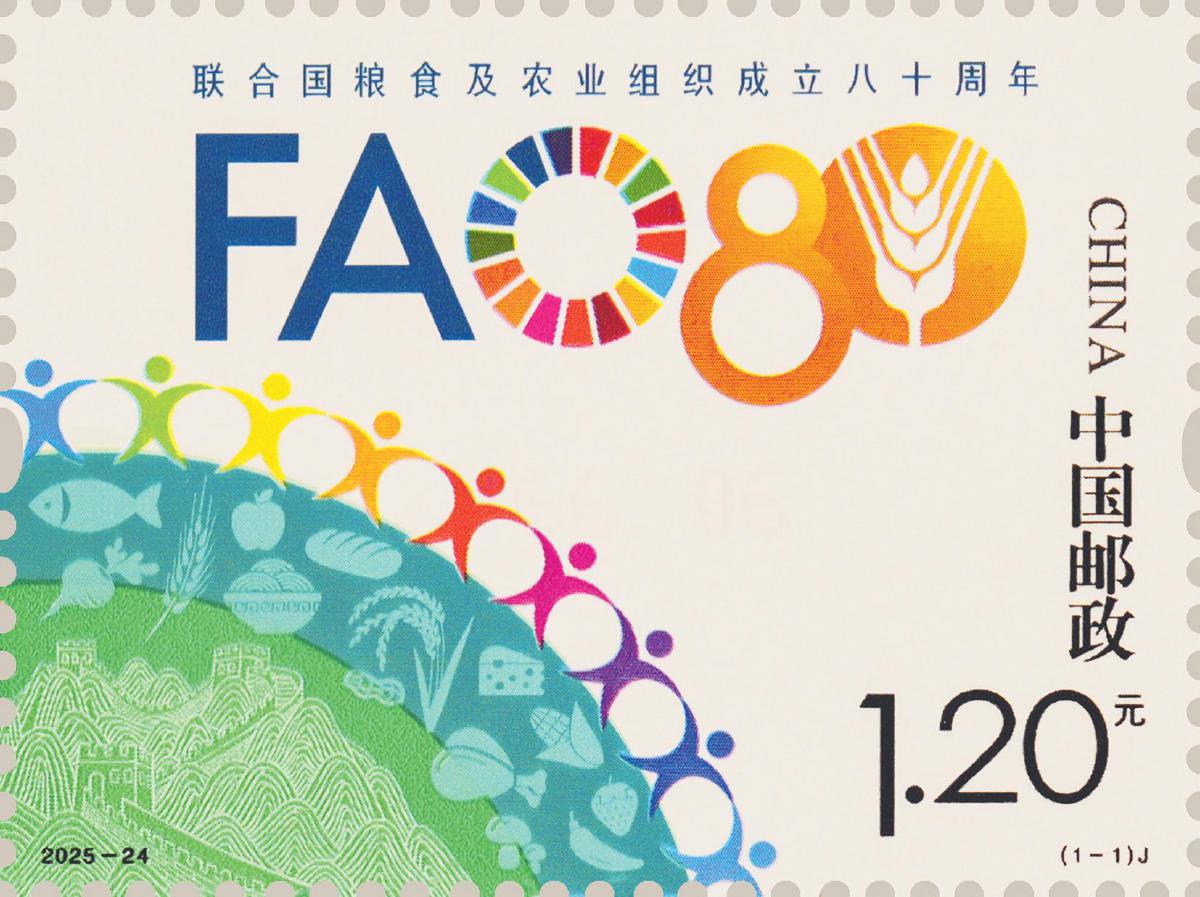 本套郵票圖案以聯(lián)合國糧食及農(nóng)業(yè)組織八十周年紀(jì)念標(biāo)識為主體,左側(cè)的藍色環(huán)形底色象征地球家園,前景展現(xiàn)了多樣美食以及象征中國的長城元素,結(jié)合并肩攜手的人物剪影,呼應(yīng)2025年世界糧食日“手拉手共倡多樣美食,聚合力同創(chuàng)美好未來”主題。
