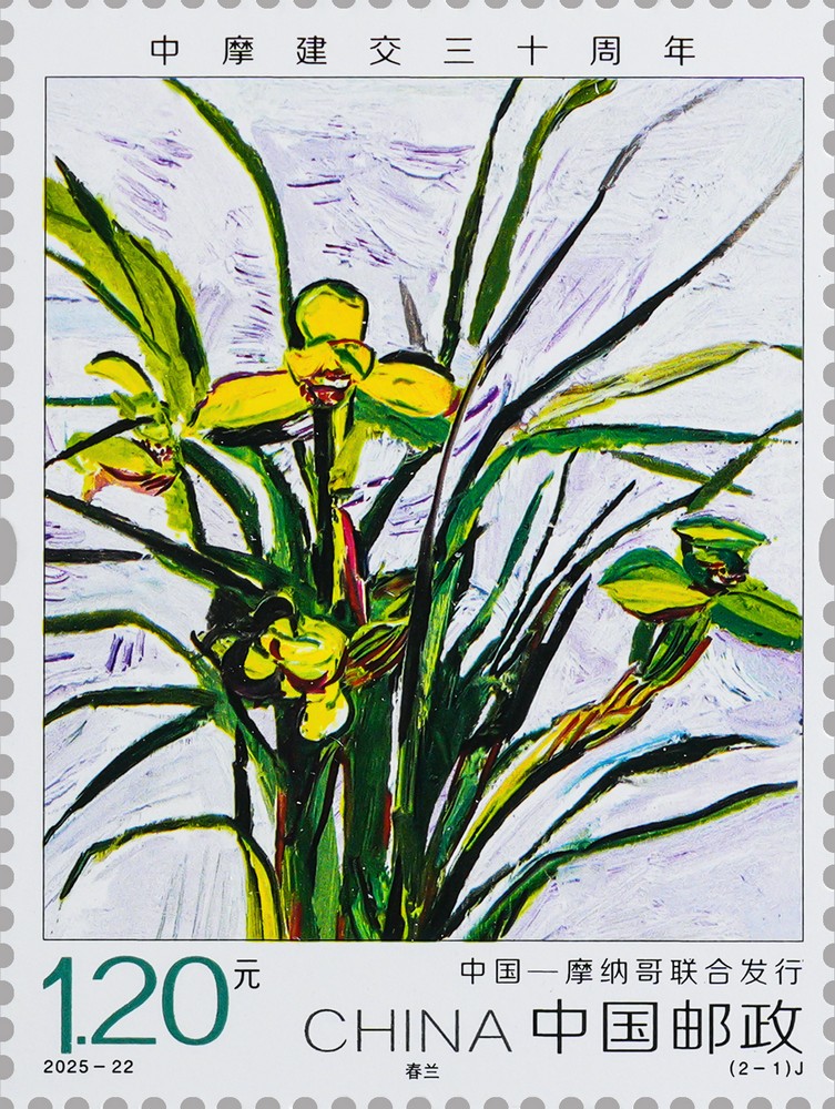 本套郵票分別選用具有兩國民族特色和深厚文化內(nèi)涵的花卉,中國選用栽培歷史悠久的春蘭,摩納哥選用美麗靈動的風(fēng)鈴草,兩種花卉彰顯出生態(tài)文明的內(nèi)在價值與精神追求。郵票圖案采用油畫表現(xiàn)方式,設(shè)計師通過大膽的構(gòu)圖、恣意的筆觸、靈活的色彩搭配,對具體的物象進行抽象提煉,從而營造出一種生動而富有生命力的畫面效果。兩枚郵票承載著“友誼長存”的深層寓意,希望中摩關(guān)系不斷取得新進展,更好造福兩國人民。